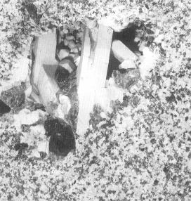 | 日本のペグマタイトの産地は岐阜県中津川市 | 岐阜県恵那郡蛭川村田原の黒雲母花嗣岩巾のペグマタイト(写真の横の長さ=約30p)。白い鉱物がカリ長石で黒い鉱物が黒雲母。写真は、豊蓬秋・青木正博著、保育社刊「検索人門鉱物・岩石』より |