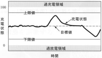 of charge)を100%にリセットするため、一つ一つの電池がすべて満充電になるように幾分「過充電」になるように充電されます。このような充電方法は発熱反応を伴うため電池の寿命を短くしますが、電池の充電量を目いっぱいにして走行距離を延ばし、また電池の充電管理精度を確保するために用いられています。このやり方を食事の仕方にたとえると、「満腹になるまで食べる」使い方です。 これに対して、ハイブリッド車の電池の使い方は決められた上下限の範囲の中で充電、放電の繰り返しになります。すなわち、図3のように電池の充電レベルを目標値に常に近づけるように制御されます。加速など電池のパワーを使うときは目標値より低めになり、ブレーキを踏んだり(制動)、坂道を下ったりするエネルギー回生状態では電池を充電します。充電状態は目標値より高めになりますが、電気自動車のように満充電にはしません。したがって走行中頻繁に充電放電を繰り返しても過充電反応を起こしませんので、電池が長寿命になるように制御されています。これをたとえれば、「規則正しく腹八分目の食事法」により長寿を得るといったところでしょうか。 |