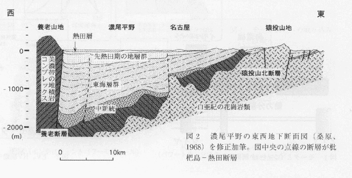 ![]() 図2 濃尾平野の東西地下断面図(桑原、1968)を修正加筆。図中央の点線の断層が枇杷島−熱田断層 |