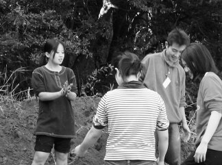 これに参加した老若男女約30名ほどは、まずは倣いとして「えー、泥を触るのー!?」と怪訝がりながら、そのうちお決まりのようにコテを放し、靴を脱ぎ、素足に素肌で土に触れ始め、その様子はあたかも子どもの泥遊びであった。