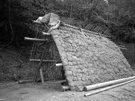 ついでなのでもう一つ、ここでさんじゅ荘について付け加えておこう。実験ハウス第1号であり私の遊び場でもある「さんじゅ荘」の敷地内に、摩訶不思議な建造物が登場した。三角形の泥の家、内部は穴が掘られている。おかざき自然体験の森プログラムの一環として分科会「わっかの会」の主宰で、ただ今建設中の竪穴式住居である。