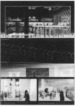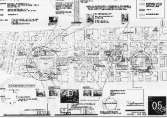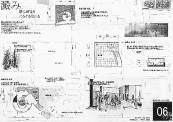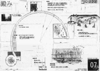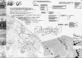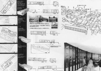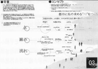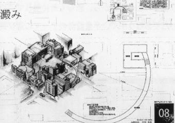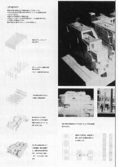 | 都市の通りを川の流れにたとえ、流れ、澱み、点といった状況に置き換えて計画している。故郷の神通川の豊かな流れに学んだものから、都会のただスピードアップする人の流れに一石を投じる提案である。たとえ話の場合、筋書きのこじ付けが気になることが多いが、この作品においては無理なく受け取れる。それは作者が冒頭において神通川への熱き思いを十分に語ったことが表紙の不思議な川面の絵と重なって、見る側の気持ちを流れに誘い込むことに成功しているからだ。現実問題として公道をまたいで敷地の異なる複数の施設を繋ぐことは難しいが、そこにある既設の建物や場所が本来持っている特質をよく読み、新しい用途や機能を街のスケールに合わせてバランス良く配置している。各々の施設は丁寧に設計されており、単調になりがちな図面表示のなかで、一見してイメージダウンになりかねない着彩パースが、他の作品から識別するのに大いに効果があったことも記しておく。(廣瀬高保) | |