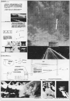 | この作品は、21世紀になった現在でも、世界各地で起こっている戦争や紛争に対して、まず、問題意識を持とうと、戦後ほぼ60年、風化しつつある日本の戦争体験、痕跡に働きかけることを、具体的な戦跡〜豊川海軍工廠跡地の整備を通して提案。 毎日報道されるイラクや北朝鮮など、「平和な日本」も無関係ではあり得ないとの認識から、恐らく折に触れてこの戦跡のことが気になっていたであろう中で、卒業設計のテーマに選び提案。 アメリカの同時多発テロ以来、建築の分野においても、戦争と平和への関心や発言が高まり多くなっている中で、このコンクールヘの応募にも、数点はこのテーマの作品があるかと思っていたが、唯一この作品のみで、心もとなく思ったのでしたが、問題設定から、具体的なアプローチ、敷地全体を記録する記念館の計画に繋げての提案であり、私としては、とても引かれた作品です。(西尾貞臣) |