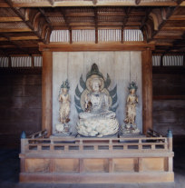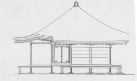 平安時代には、浄土信仰の広まりの中で人々は極楽浄土に生きることを願った。釈迦の入滅後の世の中は正法・像法・末法の3つの時代からなるとされ、正法の時代には仏教が興隆し、像法の時代には衰退し、末法の時代には滅亡して天変地異が起きると信じられ、永承7年(1052)より末法に入ると考えられた。そのため、貴族たちは極楽往生を約束するとされた常行三昧を信仰し、常行堂を建てるようになった。そこでは、念仏を唱えて一巡する行道が行われたため、方三間・方五間といった正方形の平面が用いられ、中央に四天柱を立てて須弥壇上に阿弥陀如来を祀ったため、常行堂は阿弥陀堂としていつしか広まった。 関白の藤原頼通は、父道長より譲り受けた宇治殿の地をいくばくかの余世を極楽浄土に近づけようと平等院(京都府)と改め、天喜元年(1053)に阿弥陀堂を完成させた。これが、現在の平等院鳳凰堂であり、中堂・翼廊・尾廊からなるその姿は極楽浄土の宝楼閣を彷彿とさせるものである。奥州の覇者となった藤原清衡も、都の栄華を平泉に移すことを夢みて、大治元年(1126)に中尊寺を建立した。ここに残る阿弥陀堂は、方三間の中央に四天柱をもつ有心堂形式で、内外とも金箔を押し、内部に螺鈿・蒔絵を施し、清衡・基衡・秀衡三代の遺骸を祀っており、藤原三代の栄華を象徴する中尊寺金色堂(岩手県)として知られる。この他、全国各地に阿弥陀堂が残され、願成寺阿弥陀堂(福島県)、高蔵寺阿弥陀堂(宮城県)、金剛峯寺不動堂(和歌山県)、鶴林寺太子堂(兵庫県)、富貴寺大堂(大分県)が知られる。東海地方には金蓮寺弥陀堂(愛知県)が残され、この系譜を引く妙源寺柳堂(愛知県)が残されている。 |