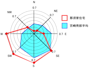 | 那須家住宅(宮崎県椎葉村)(図9)を見ると、南から西にかけて極めて大きく開放され、各室は縁側を介して南に面している。開口率(図10)は南東から西側が高く70〜80%程度で北から北東は極めて低いという特徴を有している。九州南部の伝統民家の平均は、南から西に大きく開放する傾向があるが、那須家ではさらに大きく開放している。最寄りの鞍岡観測所の風配図(図11)を見ると、2月には北東を中心に南西からも吹き、8月には南西が多いものの東北東からも風が吹く傾向が見られた。風速は夏季・冬季ともに比較的穏やかである。夏季夜間の卓越風向である南西の開口率を極めて大きくとり、風を最大限取り込もうとする意思が感じられる。また、北東に開口部が設けられており、かまどやいろりの排気が行える工夫と見ることもできる。 | ||