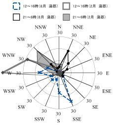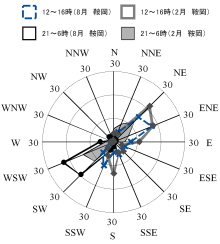 | 颯田家住宅(愛知県西尾市(旧:一色町))の平面図(図6)と開口比(図7)を見ると、南西と北東に大きく開放されている。最寄りの蒲郡観測所の風配図(図8)を見ると、8月の昼間には南南東の風が卓越し、夜には北北東の風が吹いているが、これらの風を取り込むことができる開口配置となっている。2月には西から北西の風が卓越しているが、この方 位の開口比は抑えられている。この建物の西側には物置が配置されており、冬季の季節風を遮りながら日射を得、夏季の通風を最大限確保した構成となっていた。 | ||
