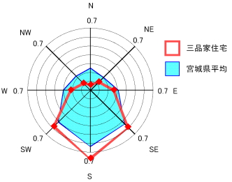 | 三品家住宅(宮城県亘理町)の平面図(図3)と開口比(図4)を見ると、南が約80%と高く、他の面は最小限の開口にとどめられていた。東北型の伝統民家の平均に類似している。縁側は後年になって付設されたものであり、古い時代ではさらに少ない開口部であったとの記述がある。最寄りの亘理観測所の風配図(図5)を見ると、冬季(2月)には昼夜ともに西の頻度が高いが、風が卓越する北西方向の開口部は抑制されており、あわせてこの方位には防風林(エグネ)がしっかりと設けられていた。8月には南東からの風が卓越するが、南東には住宅へのアプローチが設けられるなど開放されており、冬季の季節風を遮りながら日射を取得し、夏季の通風を可能としている。 | ||