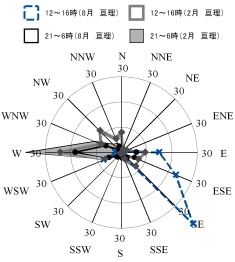 | 具体の伝統民家における開口部形態と気候条件との関係について、事例をあげて考察してみる。風況を表現するため、当該地域の拡張アメダスの風向データを整理し、各時間帯の風向頻度を求めた。民家の開口部配置と風況との関係について考察してきたが、対応が見られる民家とそうとは言えないものがあり、統一的な傾向を示すには至っていない。ここでは、風況との対応が認められた事例をいくつか取り上げてみたい。 | ||