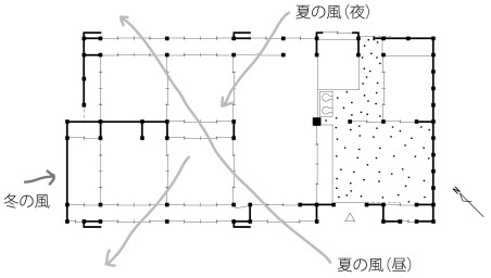 | 風には、気圧配置や地理的条件にもとづく「大気候」的な風から、建物周囲の状況によって変化する「微気候」風、そして室内の「風の道」によってもたらされる風など、さまざまなスケールのものがある。夏季の生活空間に吹き込む風は、生活に変化や喜びを感じさせてくれるものである。そして夜間換気は極めて有効なパッシブクーリングである。伝統的な設えや先人の経験則に想いを馳せながら、通風のデザインを見直し、あらためて評価してもよいのではないかと感じる。 住まいにおける風のデザインが、街に建築を開くことになり、家の中の「風の道」が家族相互の気持の繋がりになってくれれば、なお幸いである。 |