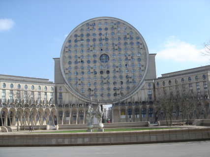 | パリ郊外の駅側に、540戸の住宅、学校、集会室が計画された。ファサードに円形を見せる2つの横倒し円筒部が向かい合い、連なる低層棟が円形に配置され両者を結んでいる。円筒住棟の足元に配されたアーケードの意匠は、ノートルダム寺院のフライングバットレスから引用している。ローコスト化を図るため、円筒部分を含めて、プレキャストコンクリートパネルを用いたプレファブリケーション工法を採用している。パリからの距離/時間という立地条件により、住民は、移民などの比較的所得が高くない世帯が多い。敷地に辿り着くと、巨大な円筒住棟と円形広場の迫力に圧倒される。 | ||