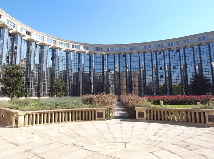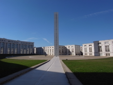 | パリの西方郊外の集合住宅団地である。駅前からのアプローチの建物群を抜けると、円形広場に達する。さらに軸線を歩くと、両脇を建物に挟まれた広場が現れ、突き当たりには、巨大公園に繋がる大階段が配置される。階段からは、軸線上に、新凱旋門と旧凱旋門が位置付けられていることが確認できる。ベルニーニの作品に触発されたとされる列柱は、素晴らしい調和とリズムを演出している。380室のアパートメントと商業施設を配置。パリの中心部を意識しながら、自然と調和した人工的な緊張感ある景観と住環境は、ボフィルの哲学と思考による傑作であるといえよう。 | ||