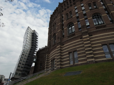 | 約100年前に建設されたガスタンクを、ショッピングセンター/アパート/オフィスにコンバージョンしている。ウィーン記念建造物の外観を保存するために、既存建物の外壁と屋根フレームを残すという設計条件に基づき、複数の建築家が各1棟ずつを計画した。円筒内部に現代的空間を挿入することにより、産業遺産との調和がとれた現在必要とされる機能での空間利用を実現した。しかしながら、商業機能部分のさらなる活性化と空間の魅力向上のためには、各棟の繋がり方の工夫、核となる施設/機能の導入があれば、という感は否めない。元の空間が円形であるために、円形の集合住宅を含む複合施設が出現した例である。 | |