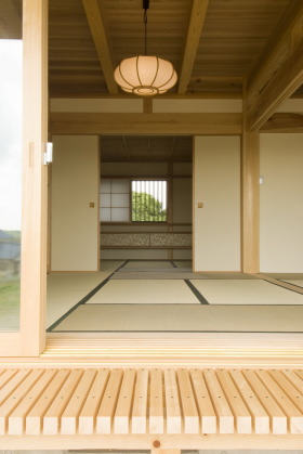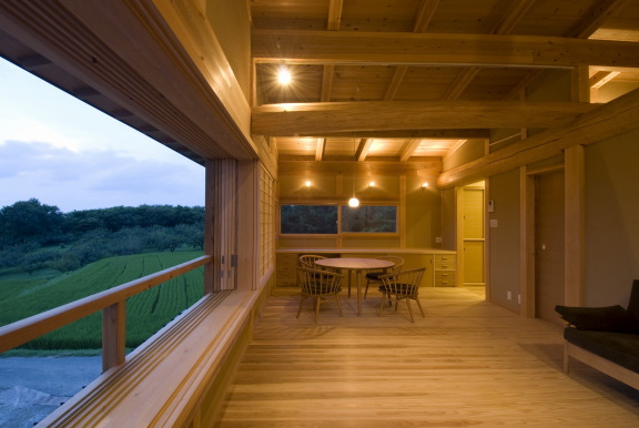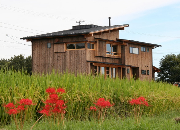 | これまで、未来を志向する「風と土の家」と題して、伝統民家における防暑と防寒の知恵や開口部の設けられ方の地域特性について見てきた。本稿では伝統的な環境調整手法を伝統的な構法を用いて現代住宅に活かした事例として、自作をとりあげ紹介したい。 「池の見える家」は私の自宅であり、夫婦と子ども2人、両親夫婦と寝たきりの祖母(逝去)、7人のために愛知県みよし市に建築されたものである。敷地は、眼下南側に池を見下ろす緩やかな丘の上にあり、四方を畑や水田に囲まれている。ゆっくり考え、ゆっくりつくるスロービルディングをめざし、地域の木と土、伝統構法を用いて、未来の家づくりを試みたいと考えた。その過程では、家族が職人とともに家づくりに参加し、さまざまな体験を積むことができた。そして、風通しのよい、室内外の気候が呼応しあうような、居心地のいい空間を実現できたと思っている。住宅建築が、住空間の創出に留まらず、そのプロセスにおける学びや、健康への貢献、伝統技術の継承、森林保全など多面的な価値をもたらすものにしたいと考えた。 |