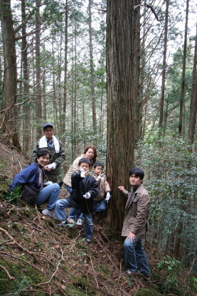 | 檜の伐採、製材、植林、鉋がけ、土壁塗り、タタキなど家づくりを通じて多くの経験を、子どもたちは積むことができた。環境教育、グリーンツーリズム、職業体験などが望まれているが、近くの山の木で「伝統的な構法」で家をつくる過程は、多くの学びの機会を内包しているように感じる。 トピックスとして、家族で参加した大黒柱の伐採とその後を紹介したい。製材所が所有する天然林で檜の伐採を行った(写真3)。みんなで選び、酒と塩でお清めをして、チェーンソーでの伐採が始まった。凄まじい音をたてて大木が倒れる様子は、衝撃的であった。切り株の年輪を子どもと数えてみると135年。生を受けたのは廃藩置県の頃だったことになる。設計の仕事では材寸を図面に記しておけば現場にモノとして材料が搬入されるのだが、目の前で木が伐り倒される様子は命を頂くという感じがして、材料との関係が変わる気がした。その後、子どもとともに製材を見学したり、植林を行ったりと楽しい体験ができた。 伐った檜の根元は大黒柱(写真4)に、先端部分は子ども室のロフトへののぼり棒(写真5)となった。のぼり棒は家の中で木登りができると子どもたちに大好評。建物の長寿命化は単にハードの問題ではなく、愛着や思い入れも大きいだろう。伐採や植林などを通じて、家づくりが木の命や山の生態系と繋がっているということを実感しながら、家族の思い出をつくることもできた。 |
