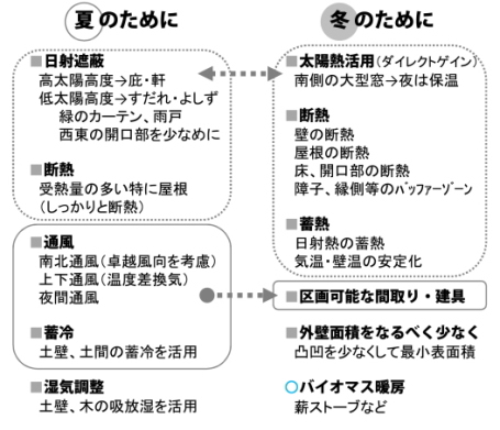 | 外皮の断熱性能に力点を置いたものが多くみられる。一方、なるべく冷暖房機器に依存せず、木や土でつくった家でスローライフと呼ばれるような、風を愉しみ、暑さや寒さともほどよく付き合ってゆく、自然とともにある心地よい生活を目指したいと考える居住者も顕在化している。その場合にはさらに多様な観点での設計が求められるのではないかと思う。 図1に「風と土の家」を考えるにあたっての、環境的な工夫を整理してみた。温暖地では、それなりに寒い冬とそれなりに暑い夏と付き合いながら、いかに環境を両立させるかが課題となる。日射のコントロールを考えると、夏は入射を抑制する一方、冬には取り入れて蓄熱する対策が必要である。通風については、夏は卓越風を取り込むと同時に水平方向と上下方向に風が流れる「風の道」を確保し、冬にはコンパクトに生活空間を間仕切ることのできる工夫が求められる。 |