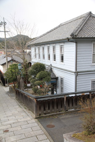 | 明治洋風建築としての全景(西南面) | 洋風上下窓がおしゃれな2階会議室 | 石畳の上り坂と街並み | |