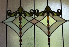 | ①デザイン構成 欄間のステンドグラスのすべてに菱の紋様が入り、縦格子に中心模様。左右、上下、または対角に対称模様。 |