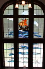 | ④まとめ 木子七郎と木内はステンドグラスの最大の見せ場を2階迎賓室に求めた。部屋から階段室への出入口扉を両脇に開けると、大海原にゆっくり進む帆船が伯爵をフランスへと誘う仕掛けだ。大窓全体のバランスから船のサイズが小さいのが気になっていたが、やっと謎が解けた。 講演会は岐阜高專准教授清水隆宏氏の手伝いもあり、無事終了。立ち席が出るほど市民の皆さんに愛されている館(やかた)だ。出会えた幸せを実感する。同じ日に、記念行事として玲光社3代目、木内英樹さんのガラスアート講座が同館地下室で開催された。受講者各人が作品を手にして大満足であったと聞く。 前述の報告書は河田克博教授(名工大大学院)の指導を受け無事執筆ができた。教授は出かけた折、足を延ばして萬翆荘を視察し、学生である私をフォローしてくださった。河田研究室では学ぶ喜びを堪能している。 |