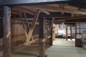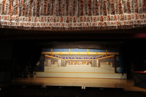 | 外観 | 舞台下 | 舞台。上から寄進札が下がる | 壁に残る古い興行ちらし | |