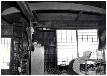 | このほかに輪中地域の水防の工夫として「上げ舟」と「上げ仏壇」が挙げられます。上げ舟は非常用の舟を常備して軒下、または土間の梁下に吊るしておくものです。母屋の入り口近くには柿の木などが植えられ、出水時にこの舟をつなぐ、「舟つなぎの木」として利用されました。 上げ仏壇は母屋の仏壇を出水時に天井の板を外して、天井裏へ滑車を用いて吊り上げるものです。浄土真宗の盛んなこの地域では、各家に置かれている仏壇が真宗特有のもので立派で大型なため、水屋に運び込むのではなく、母屋の天井裏に上げる工夫がなされました。 現在水屋は、一段高い所に建てられているため使用する際の不便さ、維持や管理のため修理などに多大な費用がかかってしまうこと、堤防が整備され洪水に見舞われることがほとんどなくなったことなどの理由から、新たに建設されることはごくまれで、古い民家の改築などにより減少するのに合わせてその数も激減しています。 しかし、水屋が果たしてきた防災の意義が再認識され、先人の生活の知恵が見直されて、荒廃していた水屋を修復した家も少なくありません。大垣市釜笛地区では、多くの家が規模の大きい水屋を残し、修復も行われており、伝統的民家の景観保存の観点からも注目すべきで、地区全体の在り様など、今後我々がサポートしてゆく義務を感じています。 |
