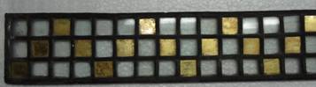 | 2001年春から明治村に毎週1回通い、修復に携わった。現在の部材と違い、ステンドグラスを繋ぐH型鉛(桟)ケームの幅が3㎜弱、厚みが約1㎜だ。鉛桟は金属劣化もあり半田付けは苦労をした。鉛桟を新しく組み直せば早いのだが、雰囲気が変わるため、打ち合わせて当時の素材を修復に使用した。デザインは一辺約17㎜の四角ガラスを格子に3段積んだ単純なものだ。金箔を挟み込んだものは千鳥状に配置。光を受けたときに□のガラス片が波状に輝き踊る個性的なデザインだ(図3)。 | ||